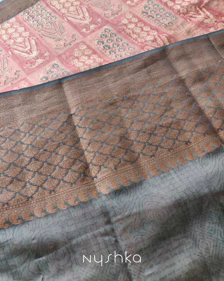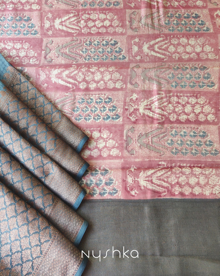 Material-Chanderi. Body pattern-Printed. Pallu-Banaras zari border. Blouse-Printed.