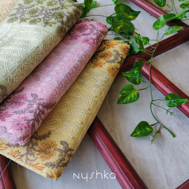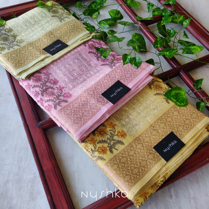 Material-Cotton linen blended. Body pattern-thread work and floral print all over the saree with gold zari border.