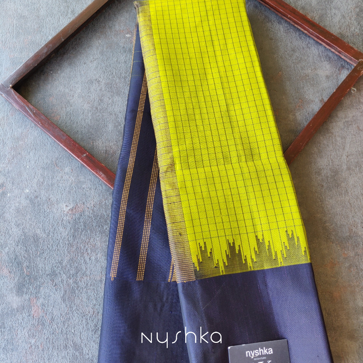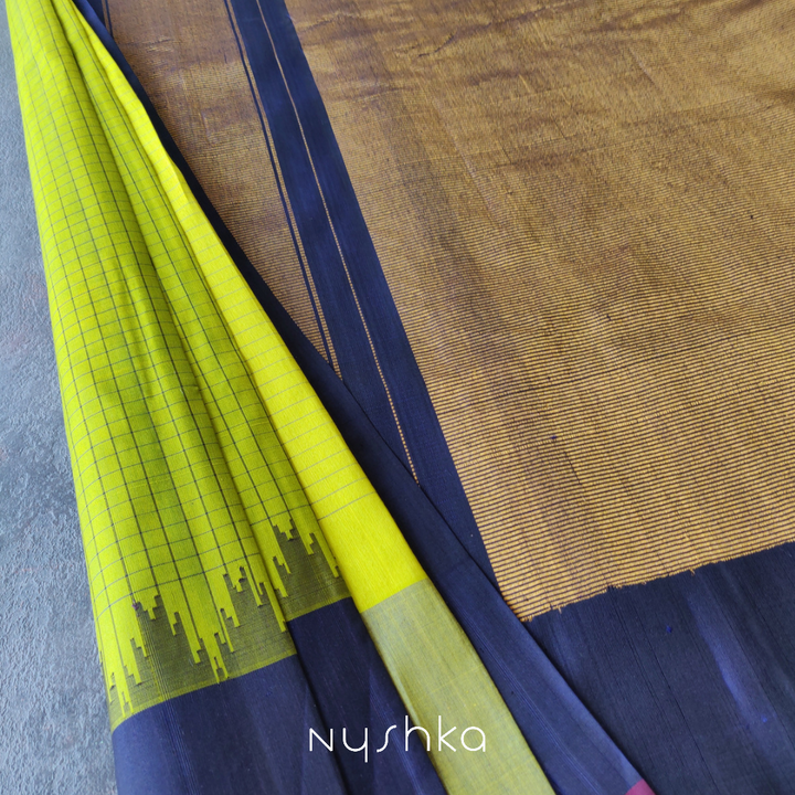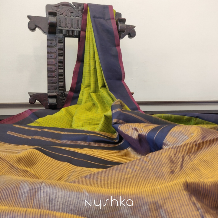 Material -Gadwaal. Body pattern- zari gold checks and blue border.Pallu in gold zari stripes and blouse in gold zari.