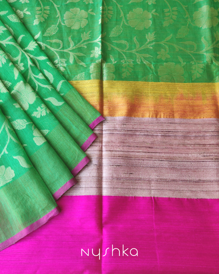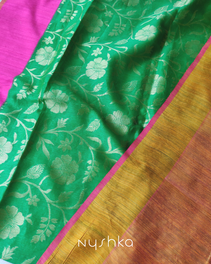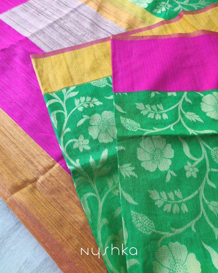 Material-Kora. Body pattern- Floral zari all over the body, pink and mustard ganga jamuna border. Pallu-Pink and jute pallu with border. Blouse-Mustard blouse with mustard border.