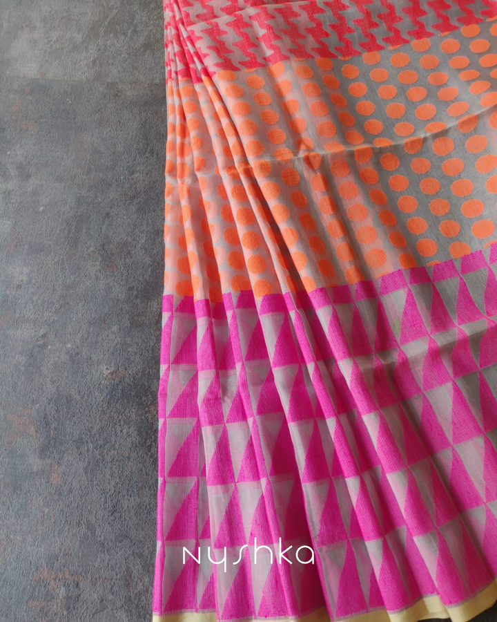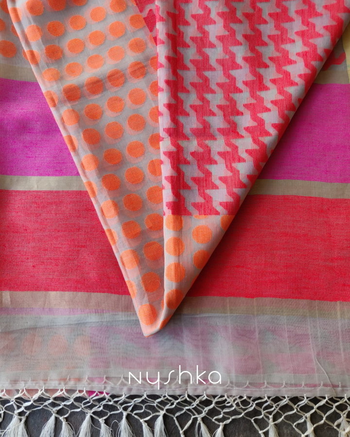 Material-Kora Jute. Body pattern- Kora jute weaving in zigzag and polka dots. Pallu- same as saree with pink & red border. Blouse-Plain blouse with pink border.
