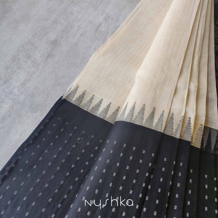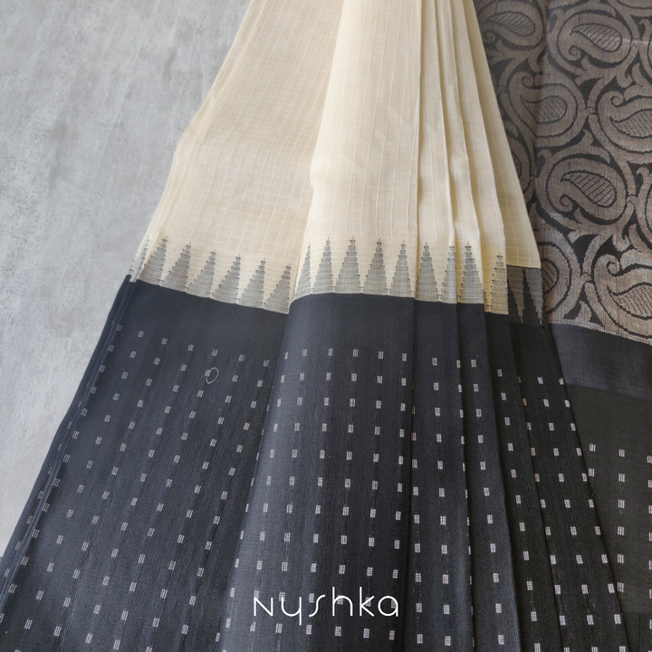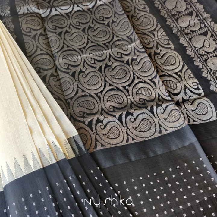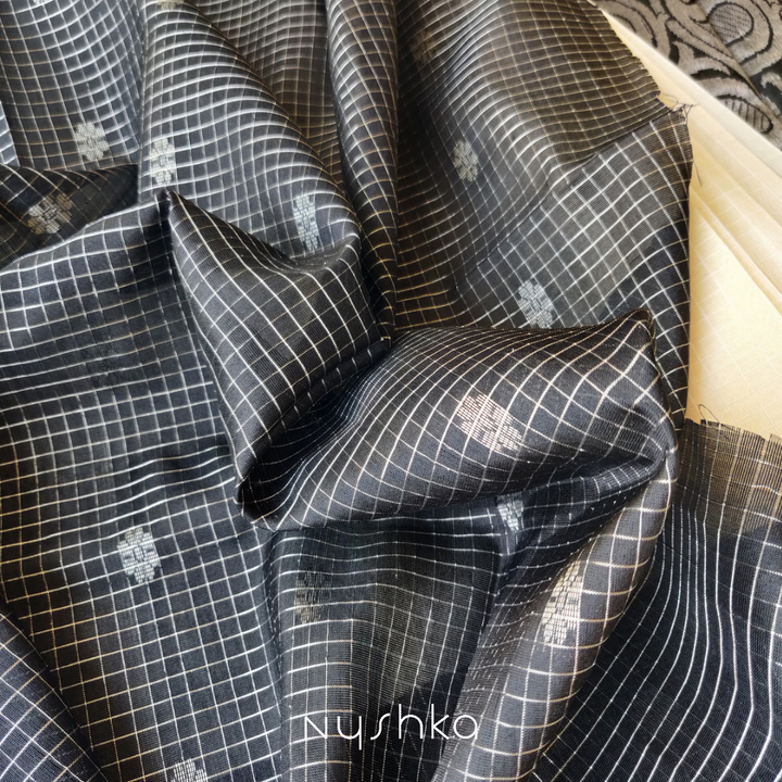 Material -Kuppadam Silk. Body pattern- plain with silver border up and black big border at the bottom with silver polkas. Pallu- in black with silver zari weaving.Blouse- Zari checked blouse with zari buttas.