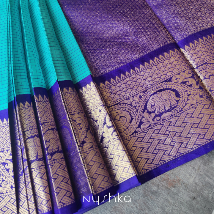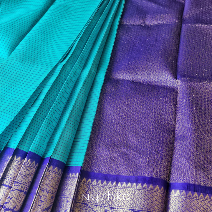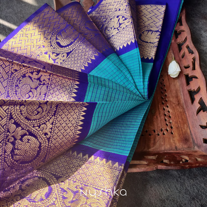 Material-Kuppadam Silk. Body pattern-Small checks all over the saree with gold heavy zari border.Blue blouse with checks and zari border.